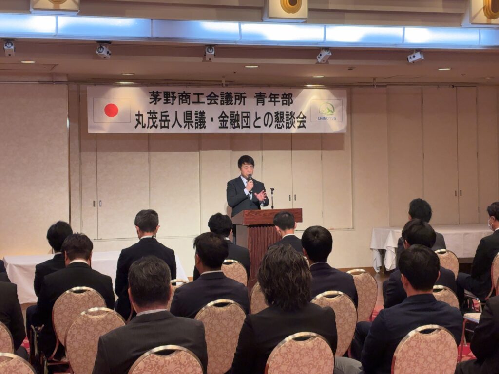 懇談会の前半では、丸茂岳人長野県議会議員からの講話をお聞きしました。県議の立場から見える政治や日本が抱える課題といった側面から、わかりやすくお話をしていただきました。